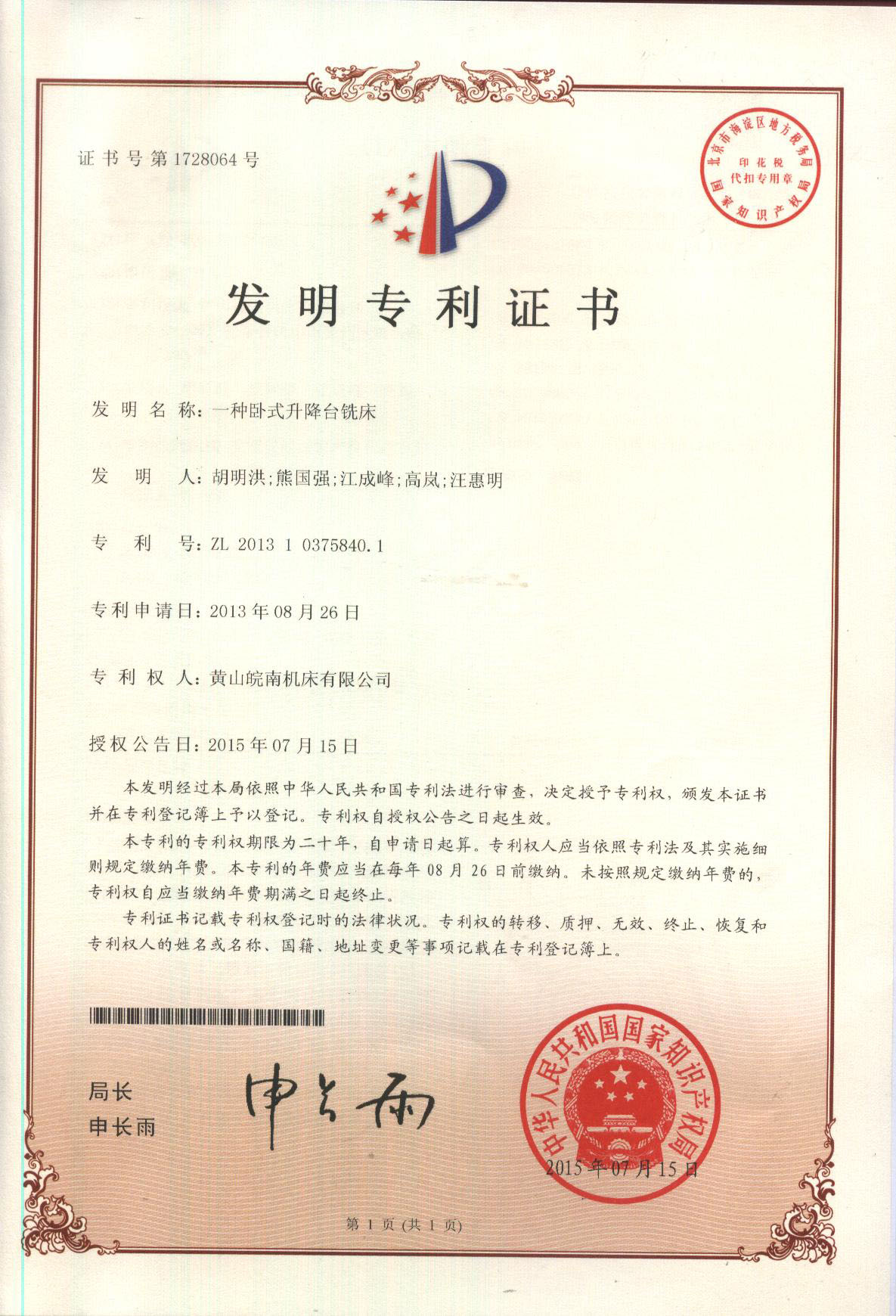 發(fā)明專利證書(一種臥式升降臺(tái)銑床)