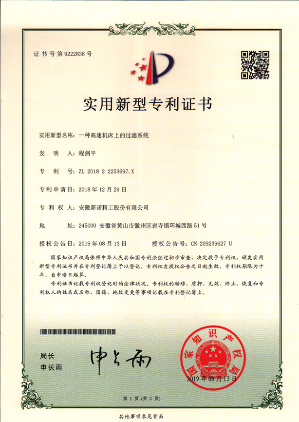 實(shí)用新型專利(一種高速機(jī)床上的過濾系統(tǒng))