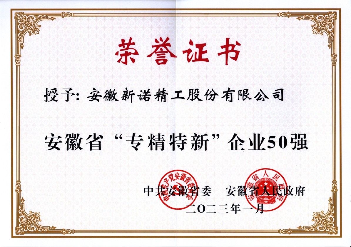 安徽新諾精工股份有限公司,入選安徽省“專精特新”企業(yè)50強(qiáng)。